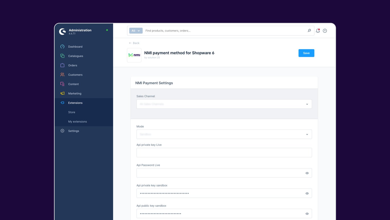 • API-Anmeldeinformationen eingeben – Konfigurieren Sie Ihren NMI API-Schlüssel im Shopware-Adminbereich.